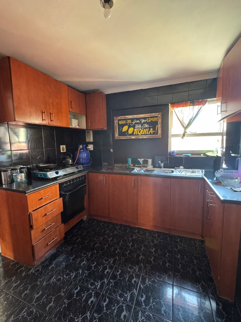 Step inside to discover a functional layout designed for comfortable living. The home includes a welcoming lounge area, providing a central space for relaxation. The kitchen, equipped with wooden cabinetry, dark countertops, and a gas stove/oven, offers ample storage and a practical L-shaped configuration, complemented by easy-to-clean tiled flooring and backsplash. Natural light filters through the window, creating a bright culinary space.