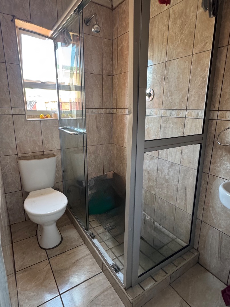 The property comprises three well-proportioned bedrooms, each offering a private retreat. These spaces feature a mix of laminate and tiled flooring, with windows allowing for natural light. The single bathroom is fully tiled, including a glass shower enclosure, toilet, and window for ventilation, ensuring a practical and easy-to-maintain facility.