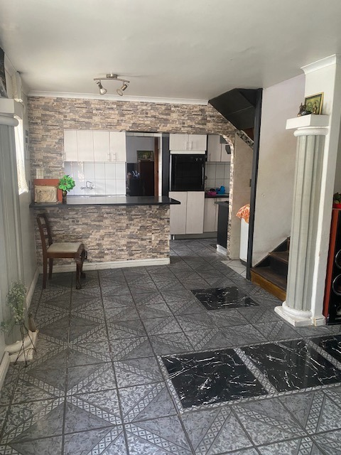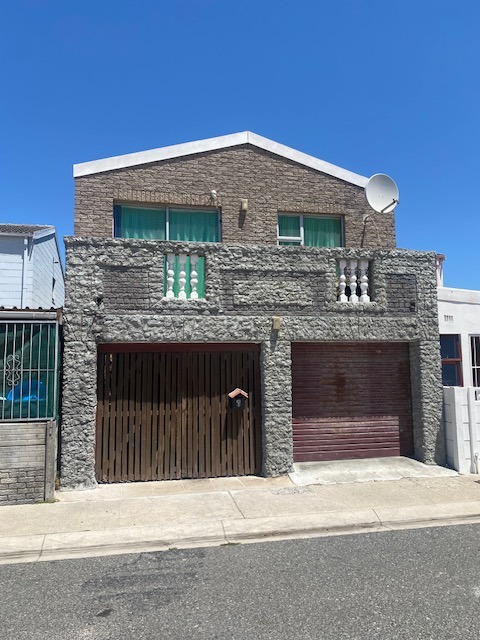Discover this inviting two-storey family home, boasting a distinctive textured stone facade and a gabled roof, offering a welcoming presence in Rocklands, Mitchells Plain. The property features two convenient ground-level garages, providing secure parking and direct access.
