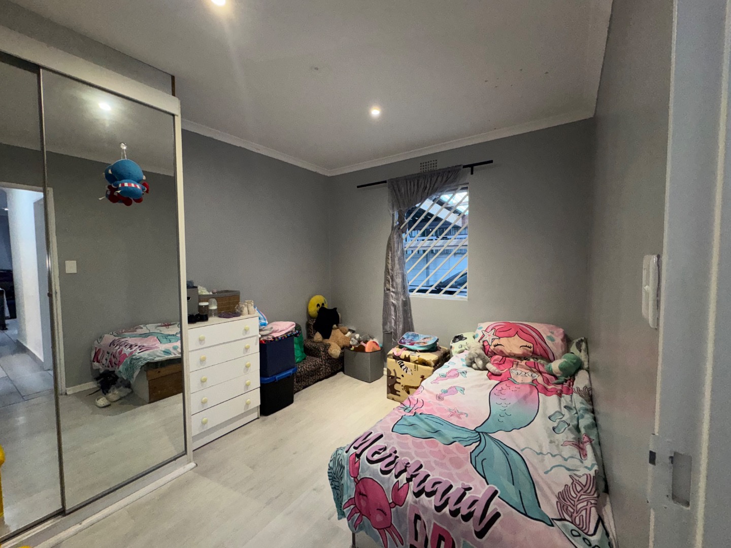 Comfort is paramount in the three well-appointed bedrooms. Each room features modern grey walls and light-colored laminate flooring, with two bedrooms benefiting from large mirrored built-in closets that offer ample storage and enhance the sense of space. The property includes two bathrooms, one of which is an ensuite, providing convenience and privacy. The bathrooms are functional, featuring tiled finishes and a shower with a rainfall-style shower head.