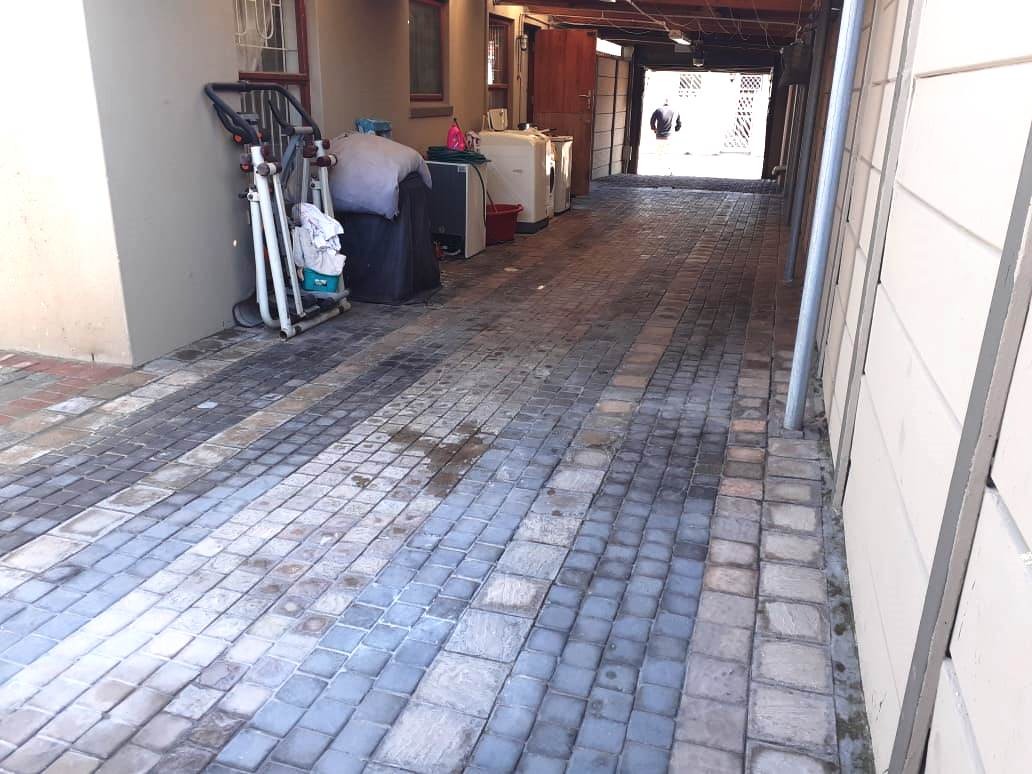 Park with ease in the under-roof parking area behind a motorized garage door, designed for two cars, with additional space for at least three more vehicles.