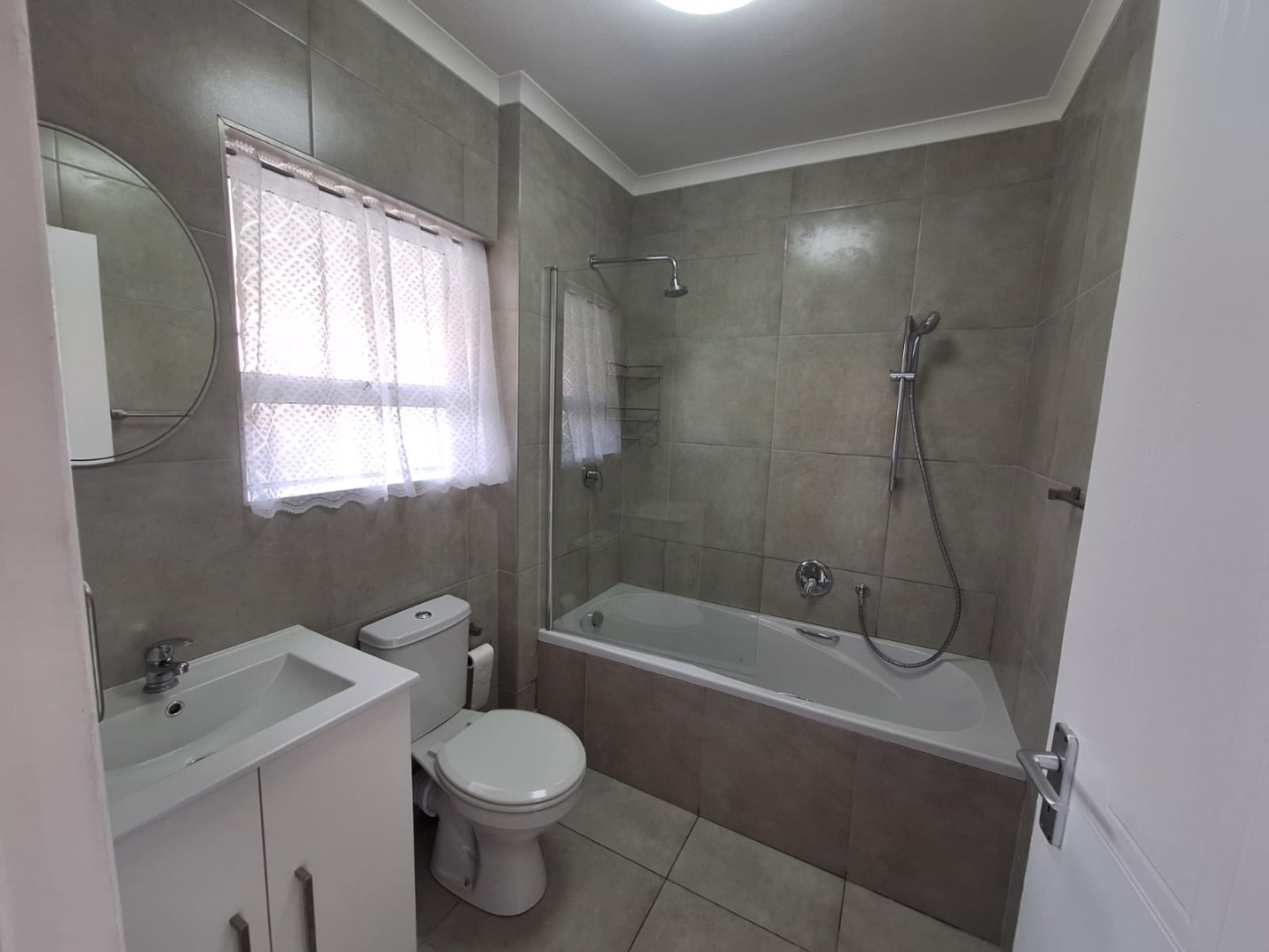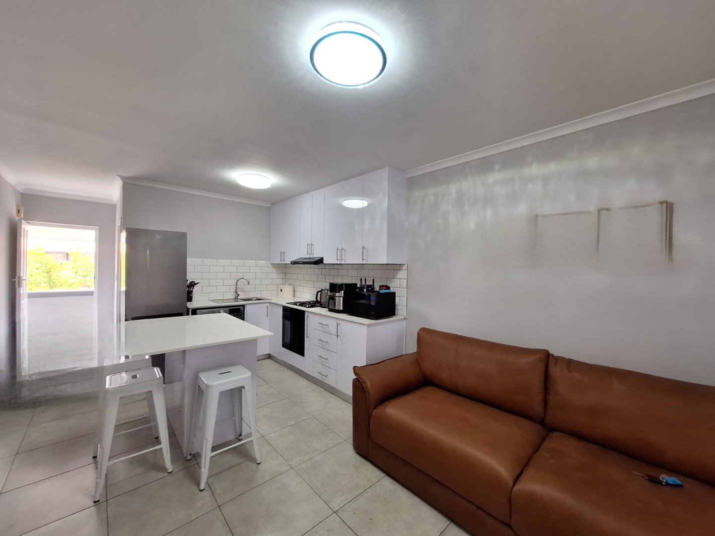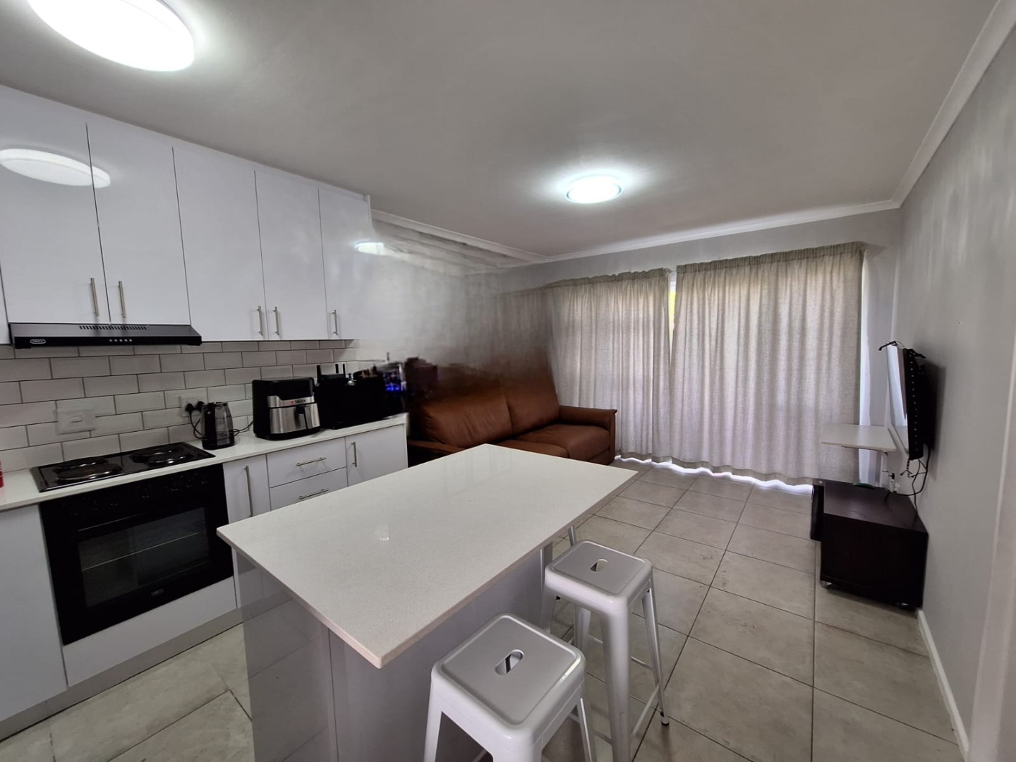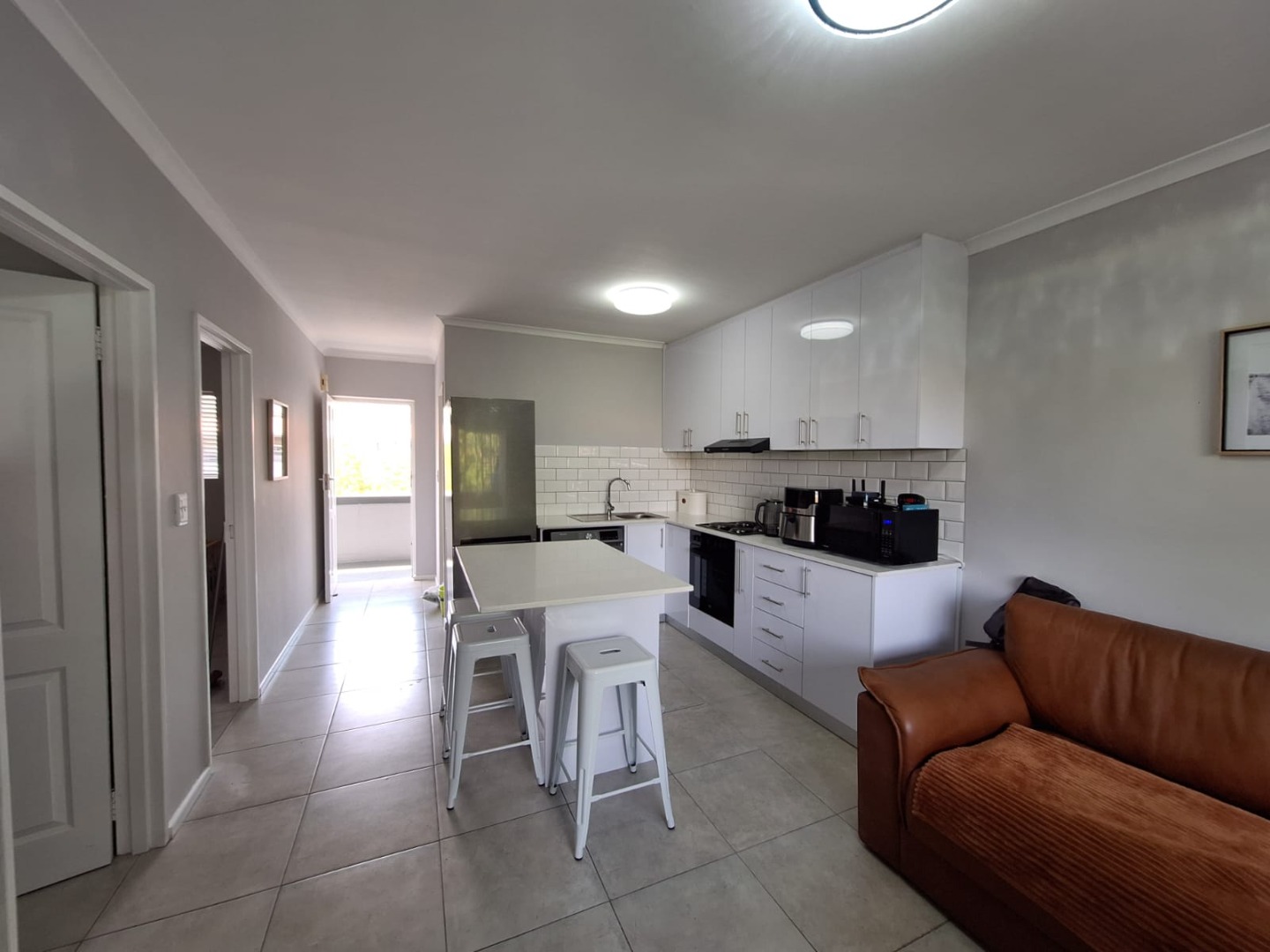 This modern fully renovated 2-bedroom, 1-bathroom apartment offers a comfortable and convenient living experience within a secure complex in Pinelands, Cape Town. Spanning 55 square meters, the residence features an inviting open-plan layout that seamlessly connects the living area with a contemporary kitchen. The kitchen is a highlight, boasting sleek white cabinetry, a stylish subway tile backsplash, and a practical island with seating, perfect for casual dining or entertaining. Durable tiled flooring extends throughout the main living spaces, ensuring easy maintenance and a clean aesthetic.