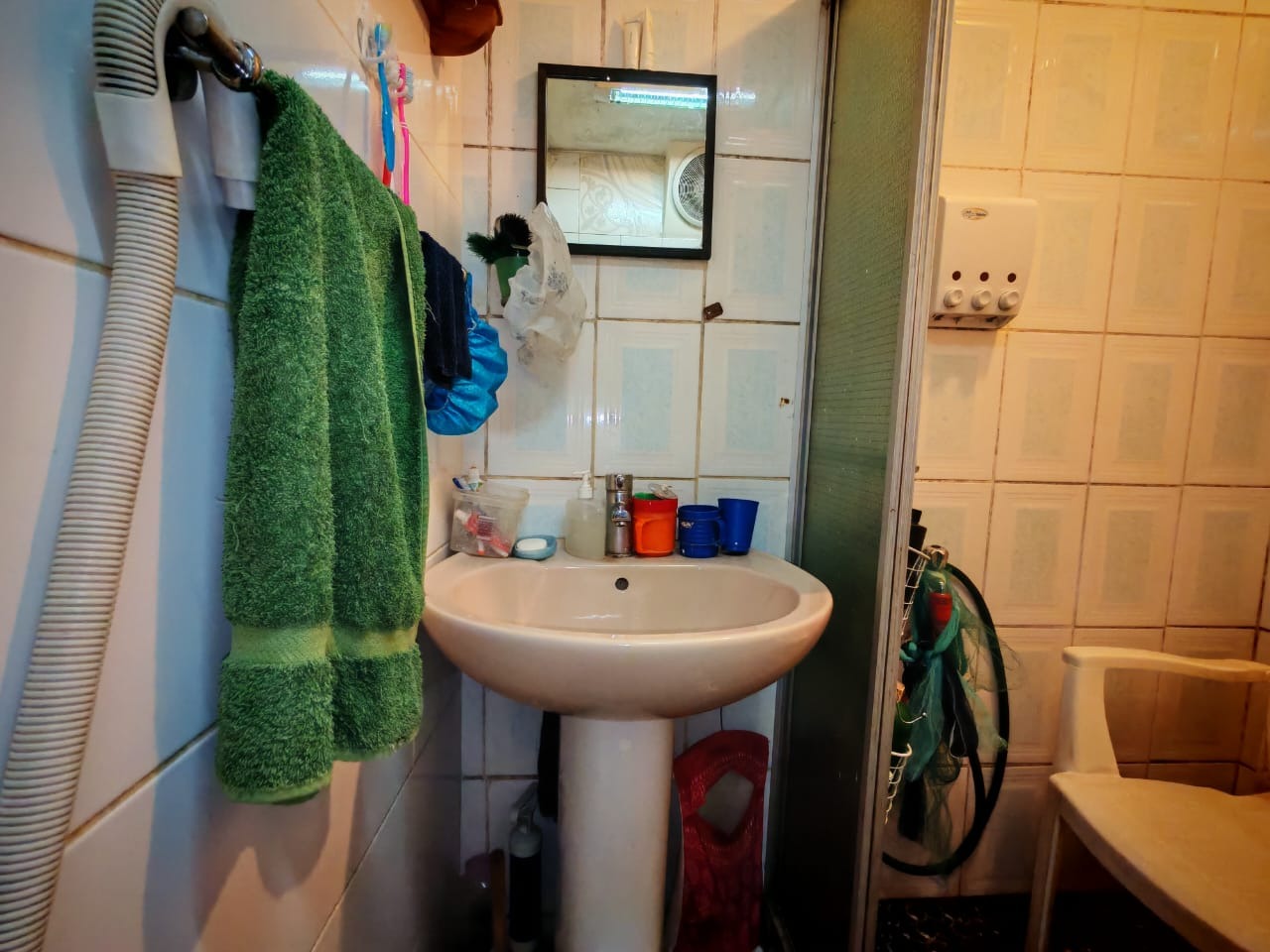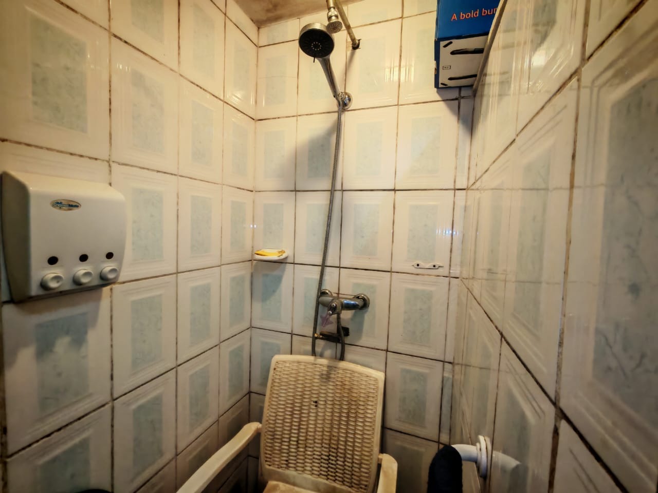 The kitchen is equipped with a double sink and built-in cabinetry, complemented by tiled flooring and walls for straightforward maintenance. Natural light further enhances this space. The bathroom, also tiled, includes a functional sink and a shower area. While the property maintains a utilitarian aesthetic, its core features are designed for practicality. Wheelchair friendly.