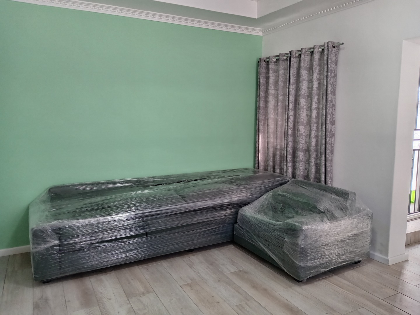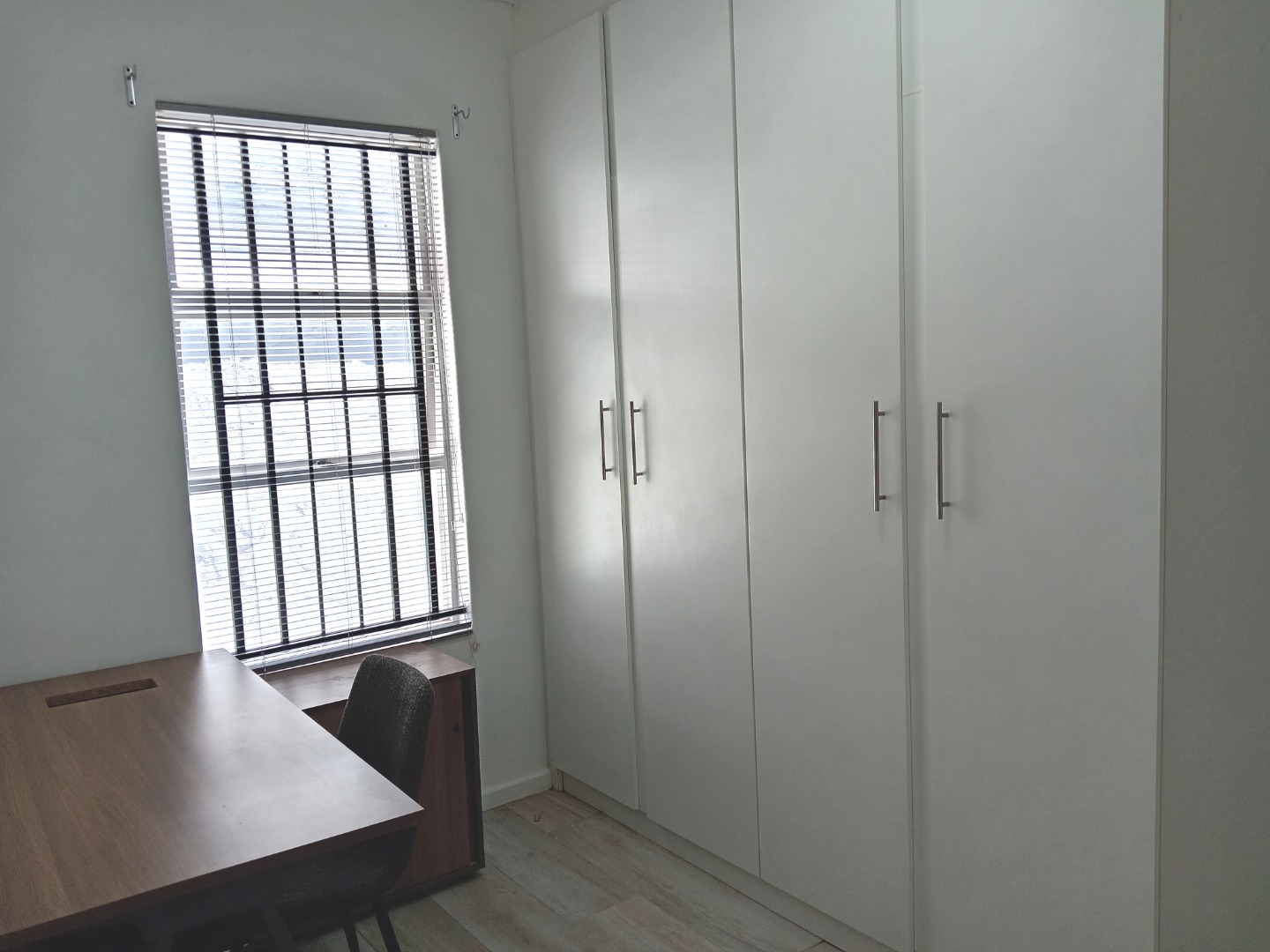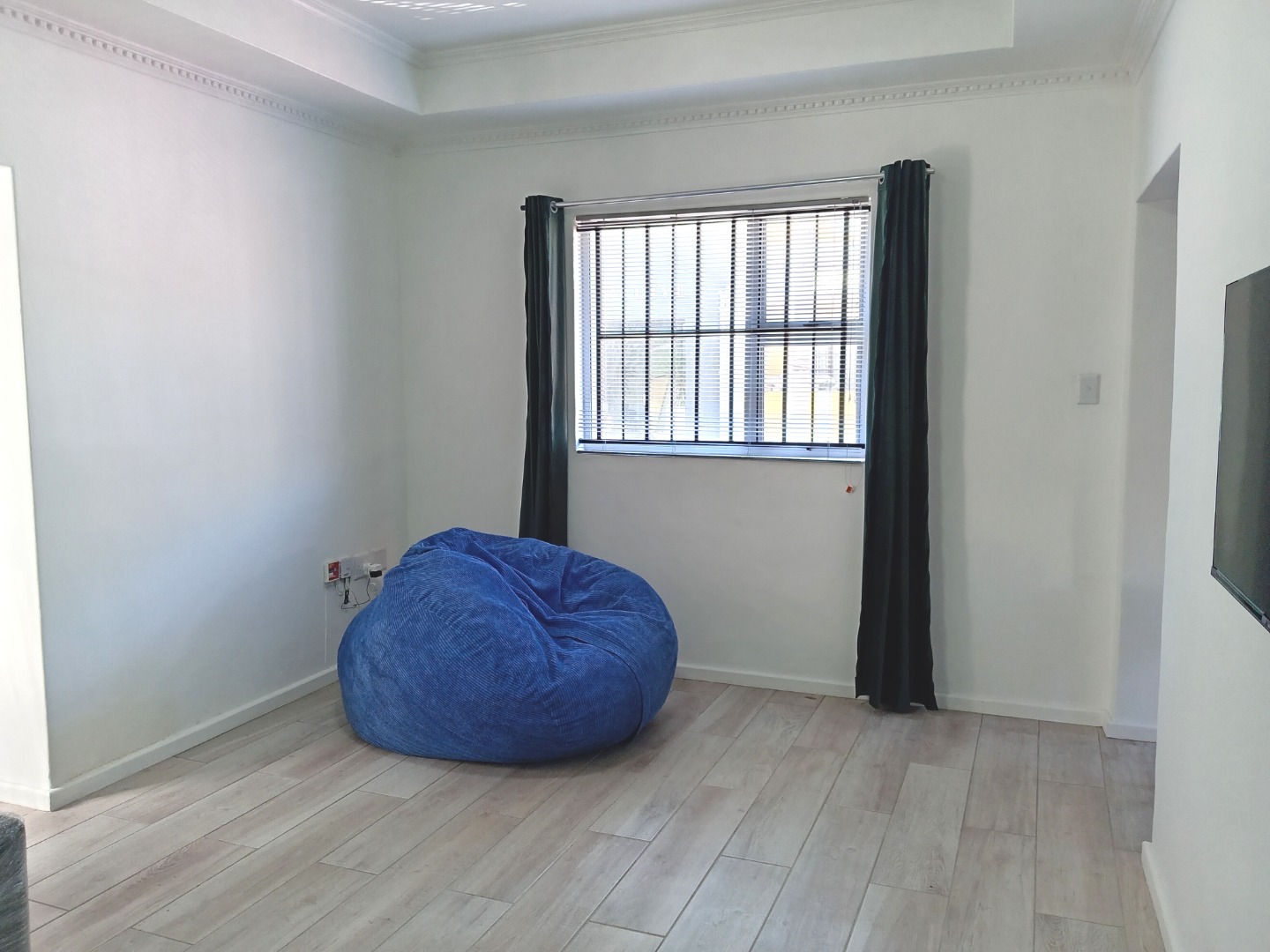 Both bedrooms are designed for comfort, complemented by a light green accent wall. Natural light fills the rooms, and security bars on the windows for peace of mind. This unfurnished residence offers a versatile canvas for tenants to personalise their living space, making it an ideal lock-up-and-go option for professionals or a small family.