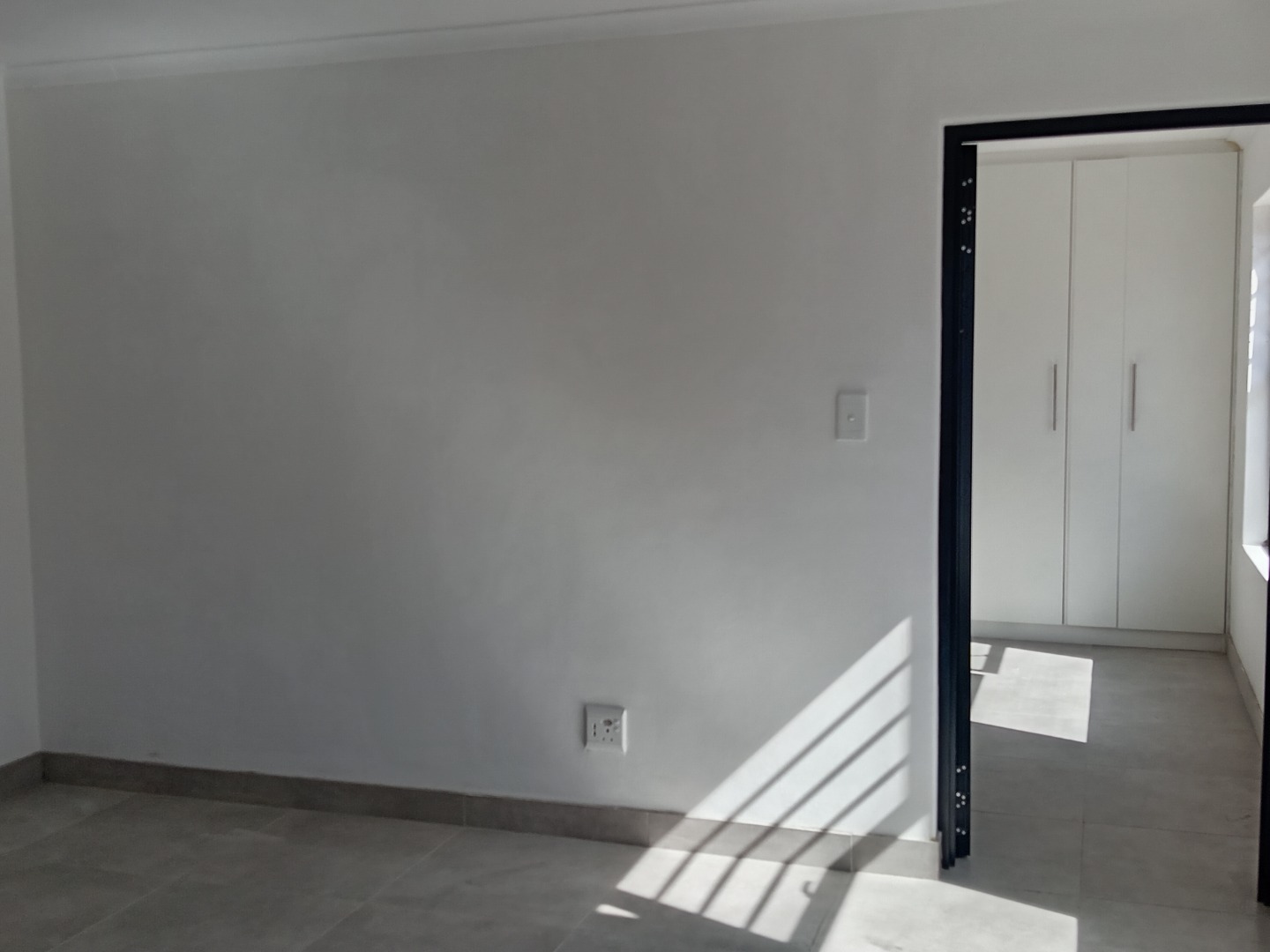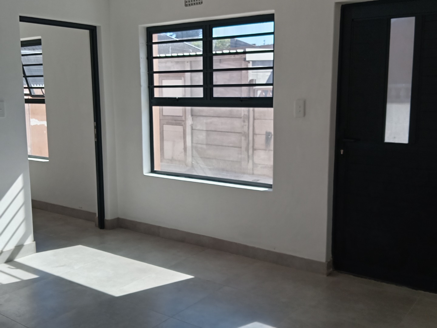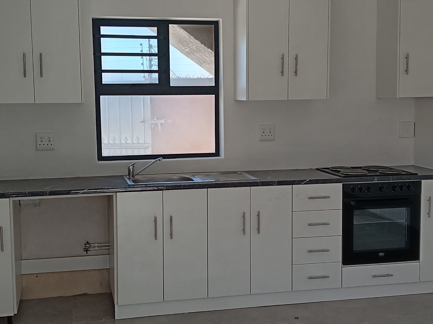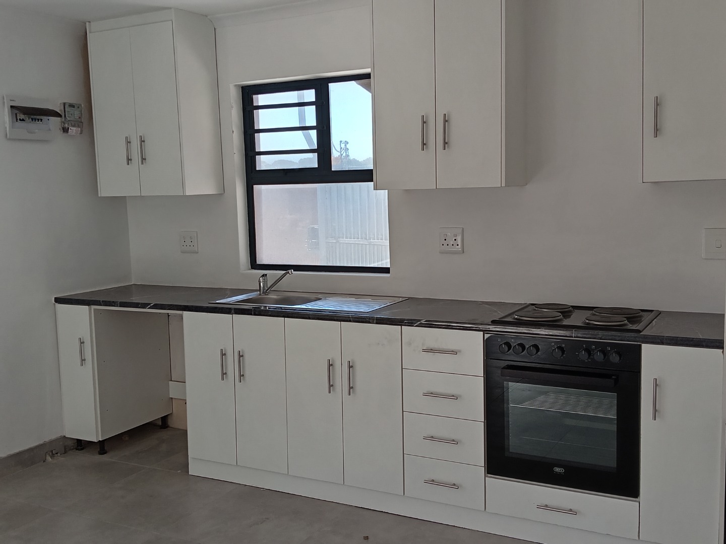 Discover this modern and secure 1-bedroom flatlet available for rent in the desirable Southfield area of Cape Town. Designed for comfortable living, this unfurnished unit offers a pristine interior with freshly painted white walls and contemporary tiled flooring throughout, providing a neutral canvas for your personal style. The well-appointed kitchen is a highlight, featuring sleek white shaker-style cabinets, dark marled countertops, a built-in electric oven, and a four-plate electric hob. Ample storage is provided by both upper and lower cabinets, complemented by a stainless steel sink positioned beneath a window that invites natural light.