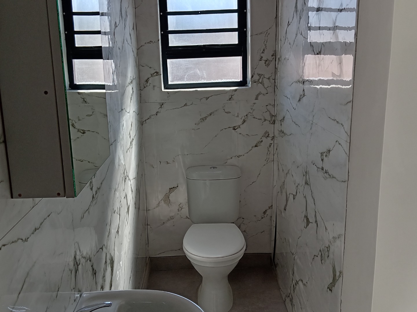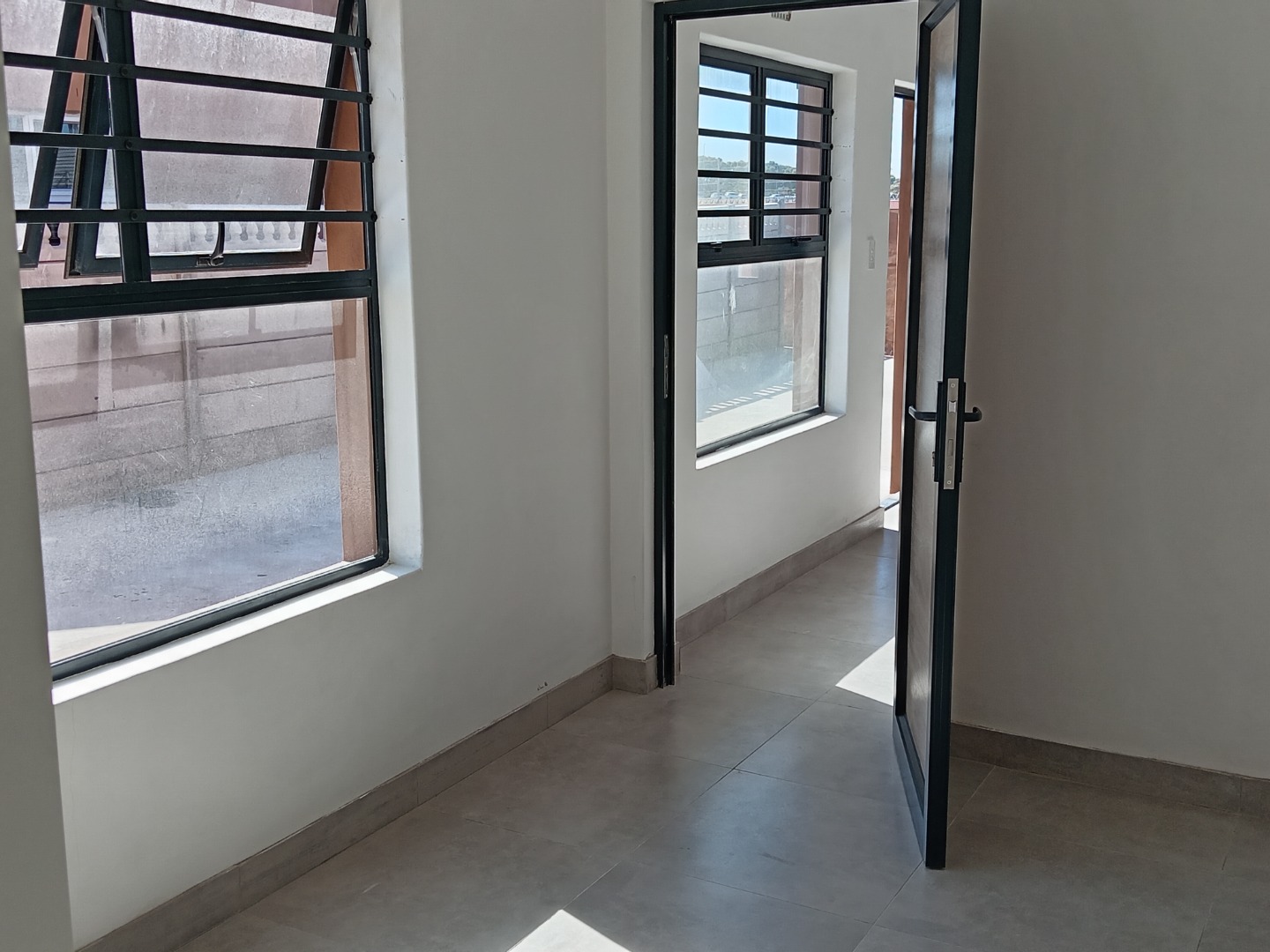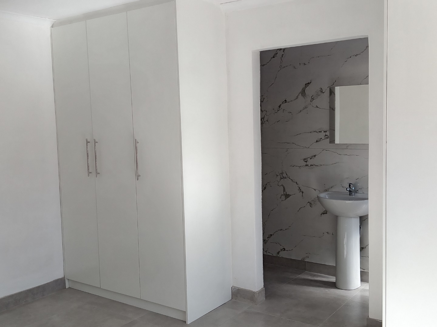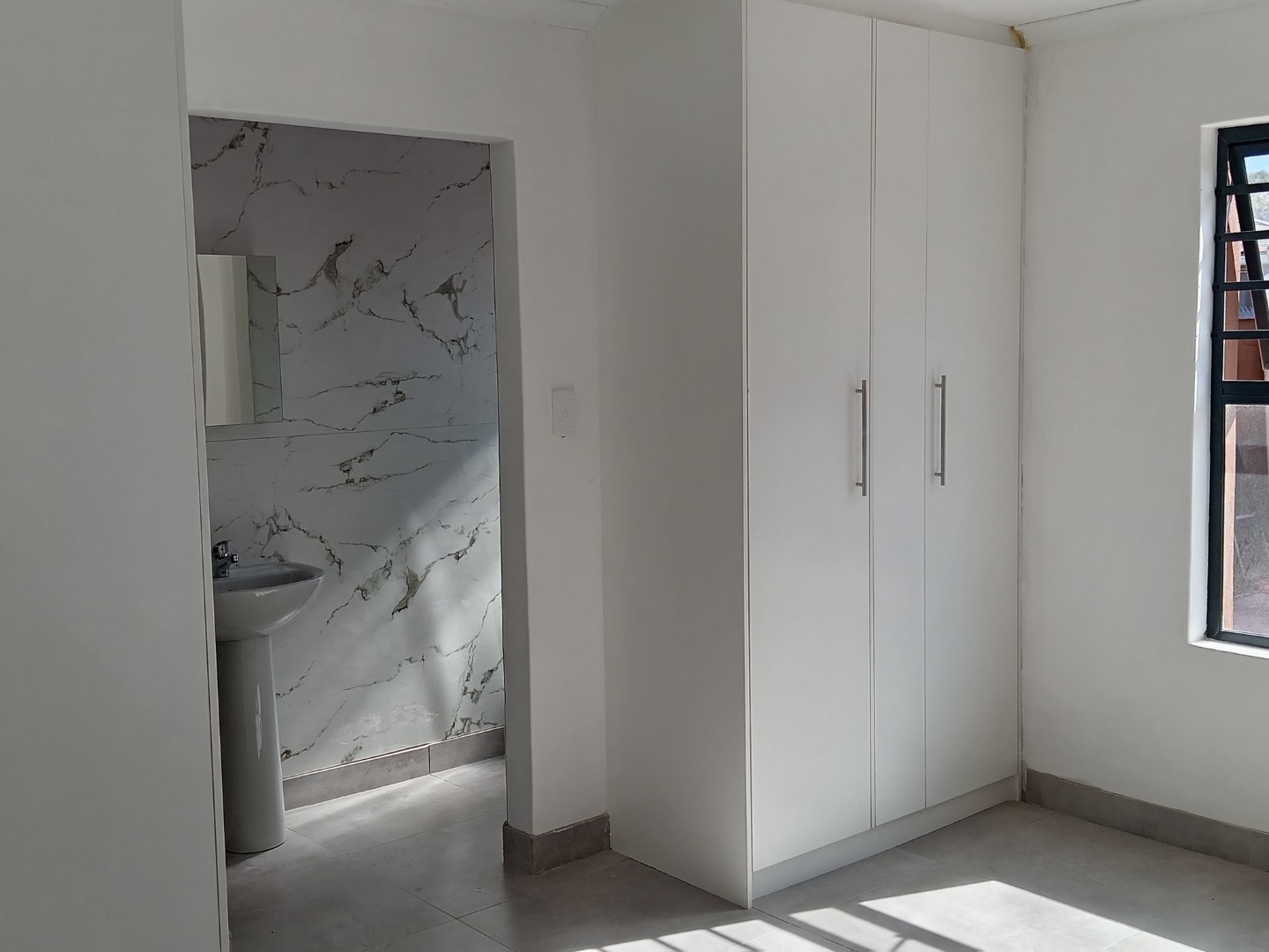 Discover this modern and secure 1-bedroom flatlet available for rent in the desirable Southfield area of Cape Town. Designed for comfortable living, this unfurnished unit offers a pristine interior with freshly painted white walls and contemporary tiled flooring throughout, providing a neutral canvas for your personal style. The well-appointed kitchen is a highlight, featuring sleek white shaker-style cabinets, dark marled countertops, a built-in electric oven, and a four-plate electric hob. Ample storage is provided by both upper and lower cabinets, complemented by a stainless steel sink positioned beneath a window that invites natural light.