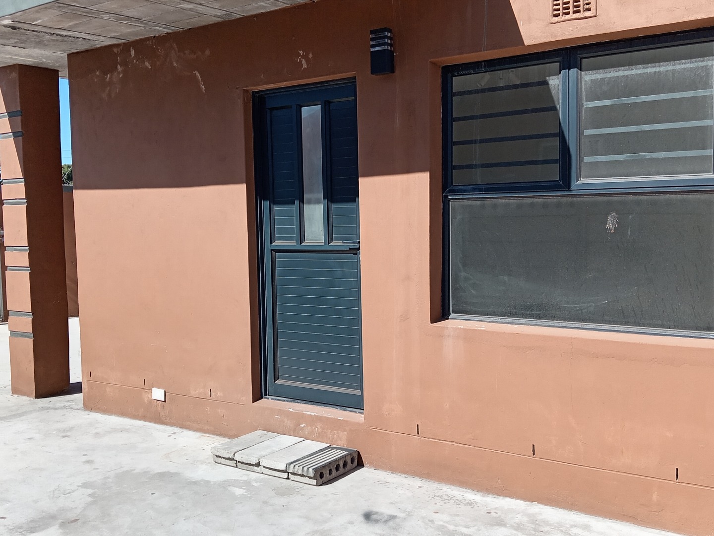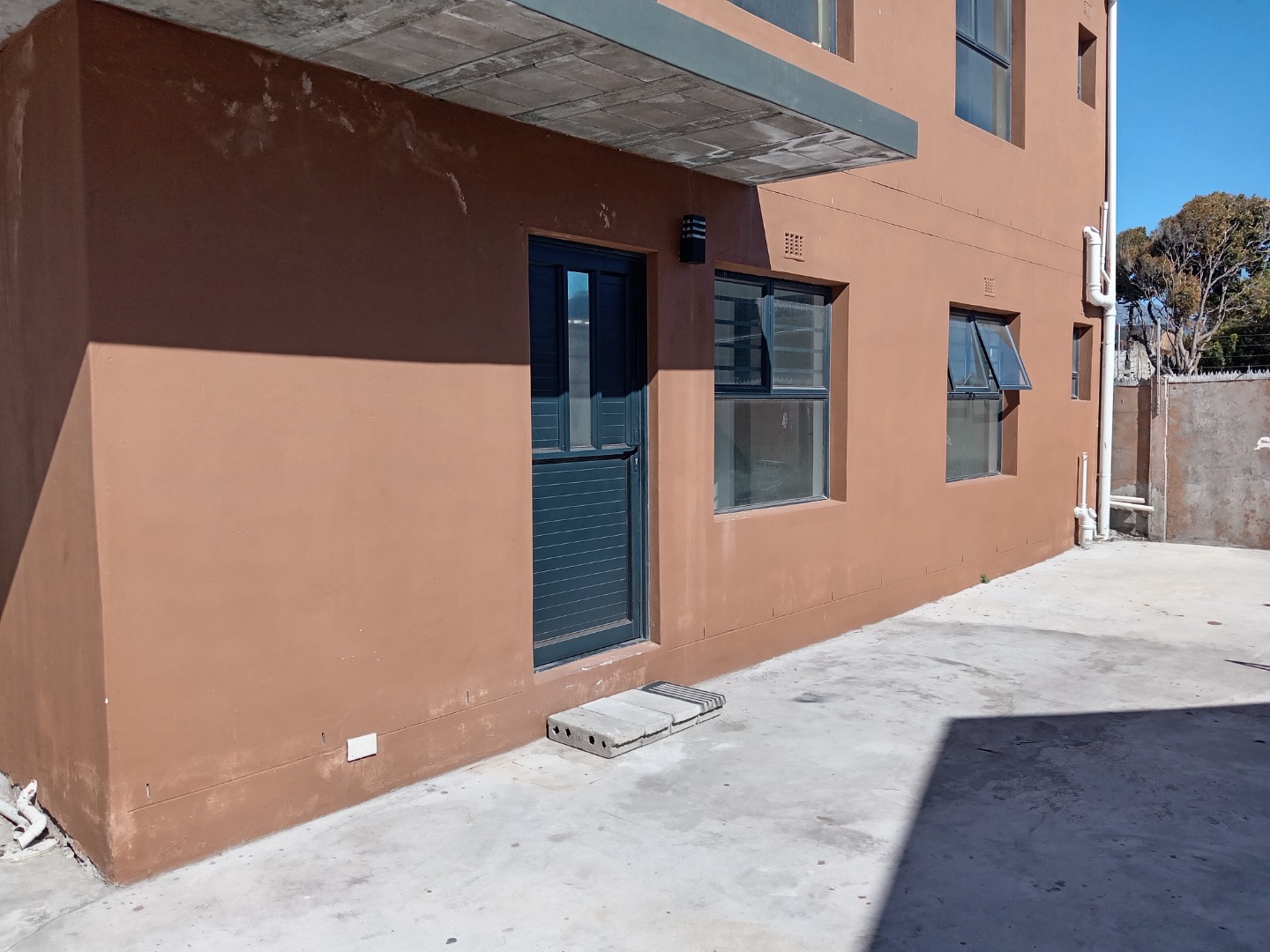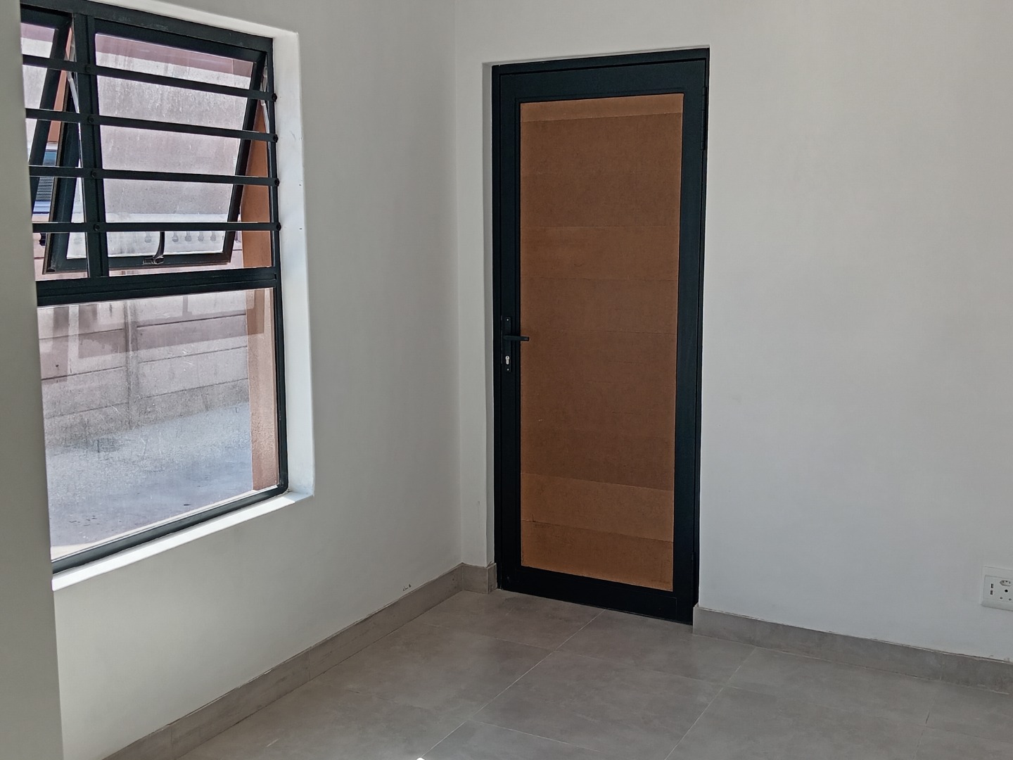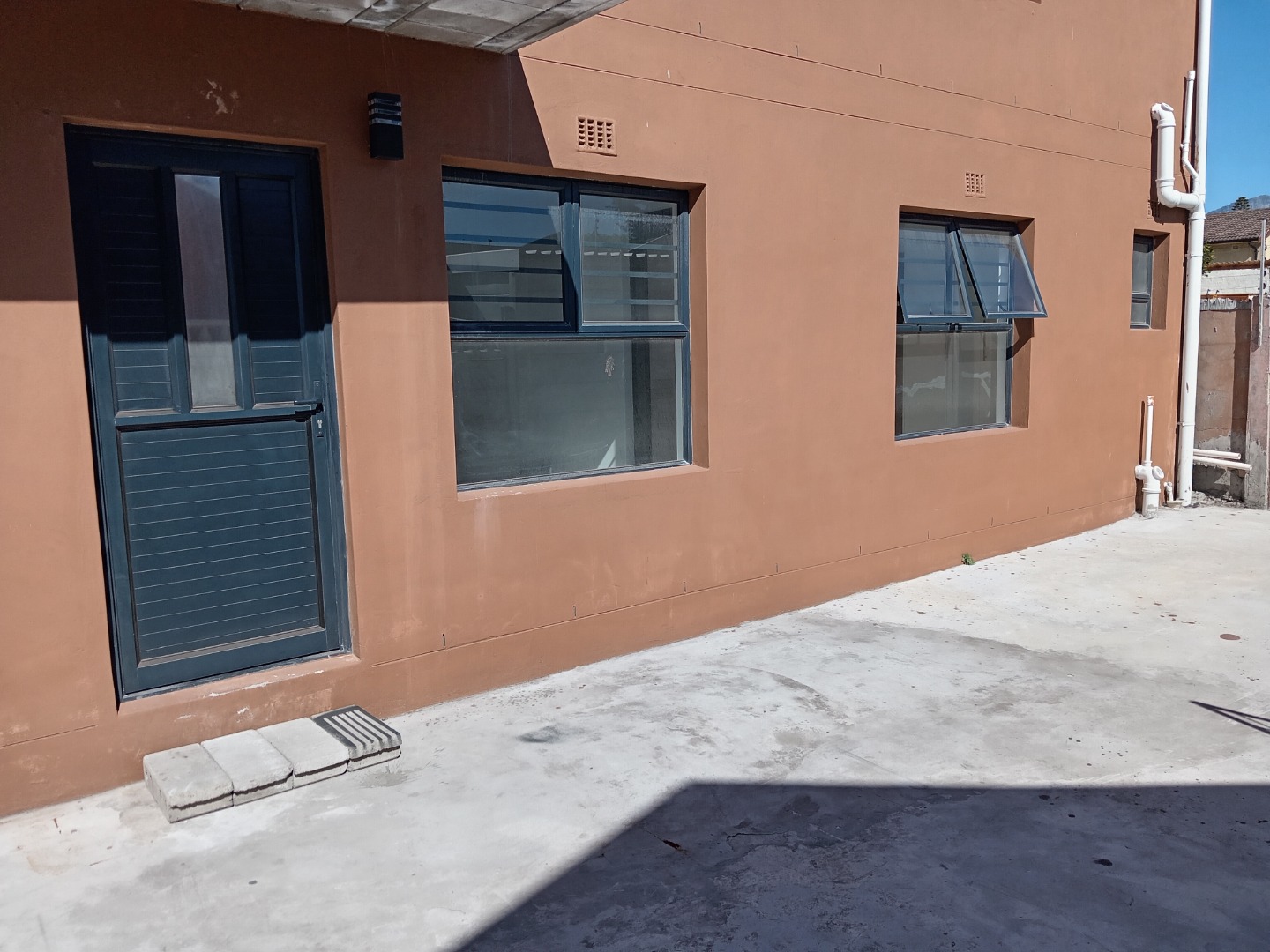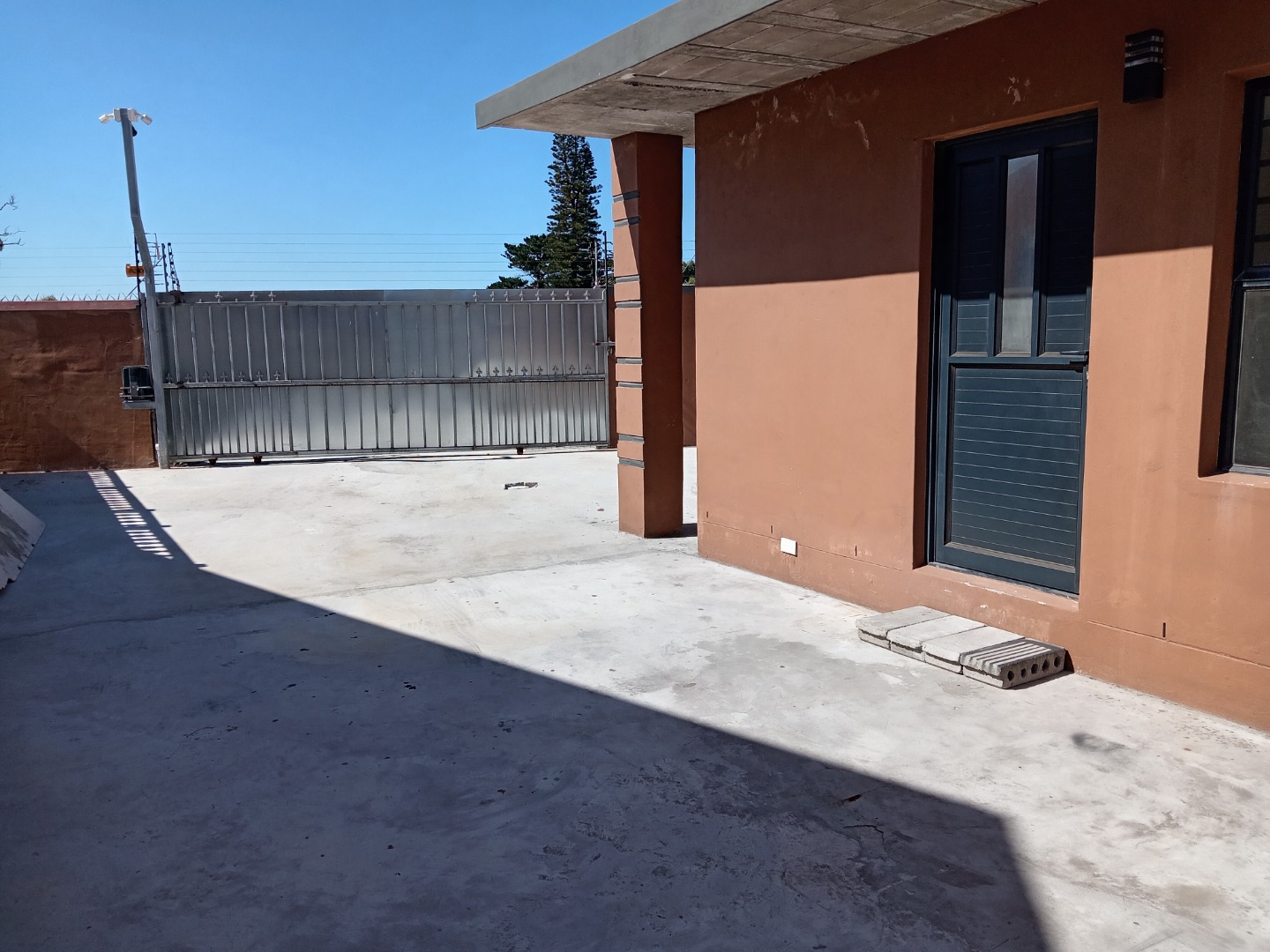 Security is a top priority, with robust features including a secure metal sliding gate, a separate pedestrian gate, and perimeter walls topped with electric fencing. For added peace of mind, all windows are fitted with security bars, and the property benefits from solar panels, contributing to energy efficiency. The exterior boasts a modern aesthetic with burnt orange walls and a large, concrete paved area providing two dedicated parking spaces.