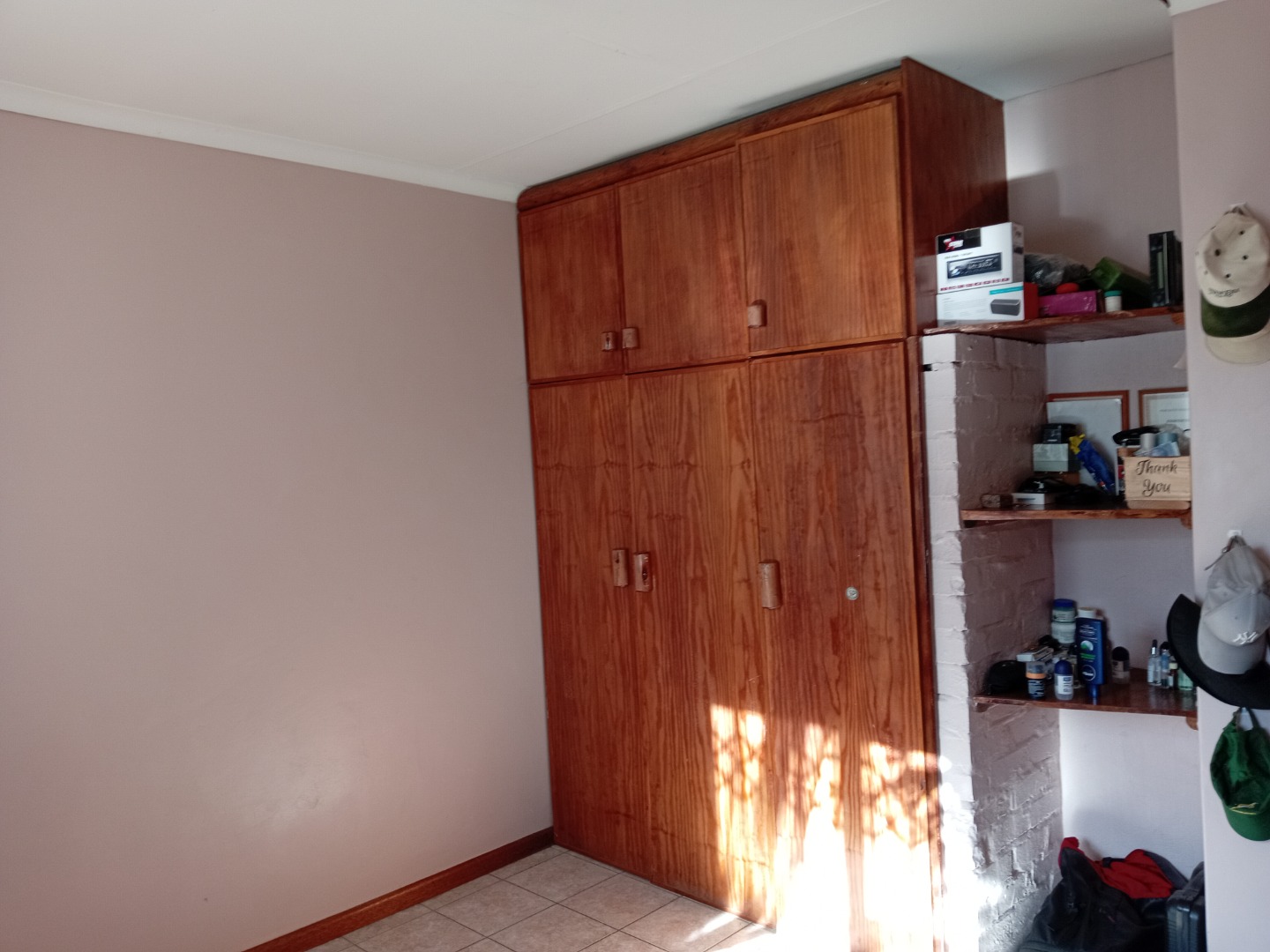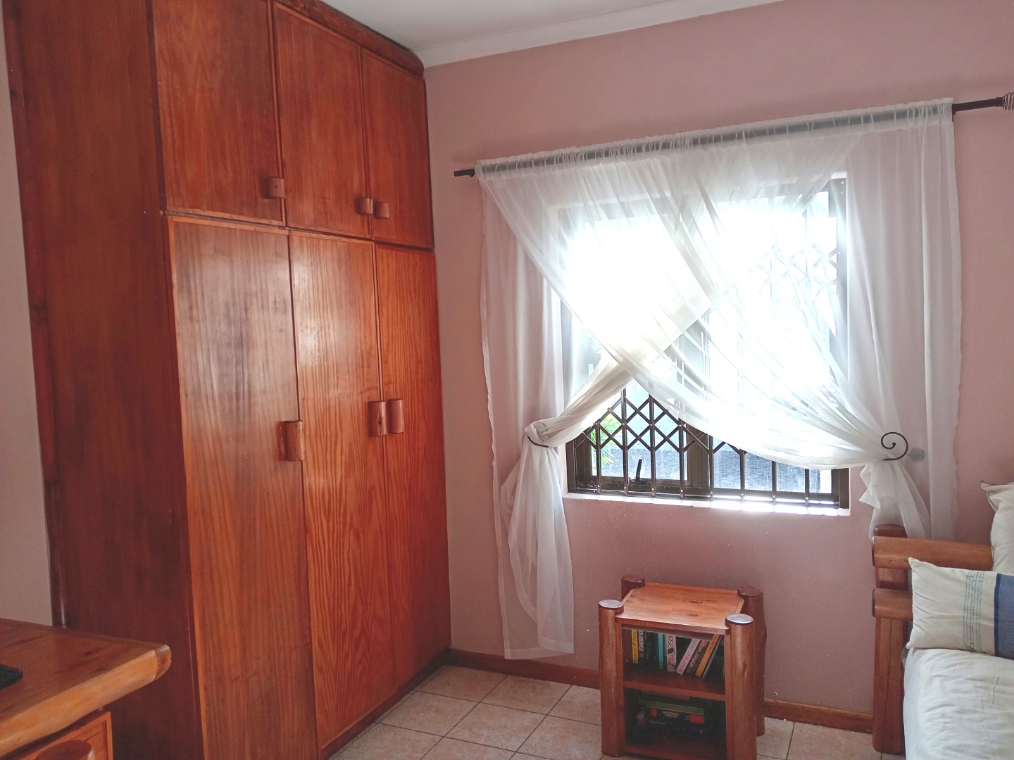 3 large bedrooms with built-in cupboards, floor tiles, study desks, and chairs.