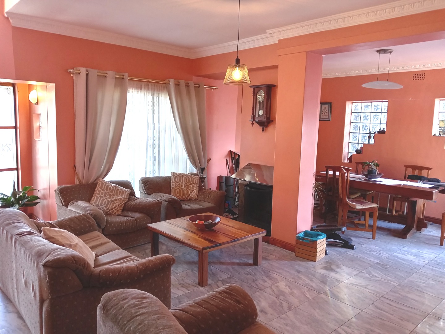 Spacious open-plan lounge and dining room with floor tiles, built-in fireplace, a 4-seater lounge suite, and a wooden dining table with 6 chairs.
