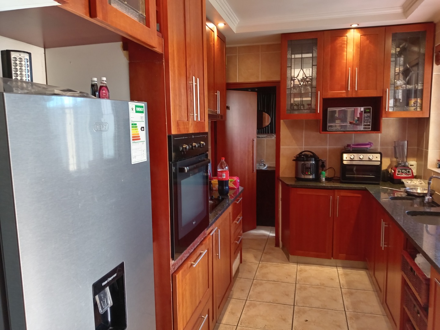 The kitchen is a real highlight, featuring ample wooden cabinetry for all your storage needs, complemented by dark granite-style countertops. It comes equipped with an integrated oven and hob, plus a modern stainless steel refrigerator, making meal prep a breeze. This home is designed for comfortable living, offering a practical layout that suits families or professionals looking for a convenient and charming place to call their own.