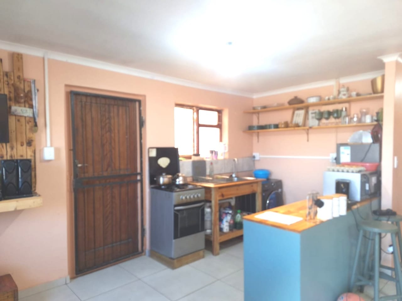 The kitchen, a central hub, provides a functional space with open shelving, a freestanding stove, and a convenient breakfast bar, perfect for casual dining or additional prep space. While offering essential amenities, the kitchen presents an opportunity for tenants to personalize the aesthetic to their taste. The single bathroom includes a glass-enclosed shower, toilet, and a wall-mounted sink, providing all necessary facilities. A versatile smaller room, currently configured as an office or treatment space, adds flexibility to the property's use.