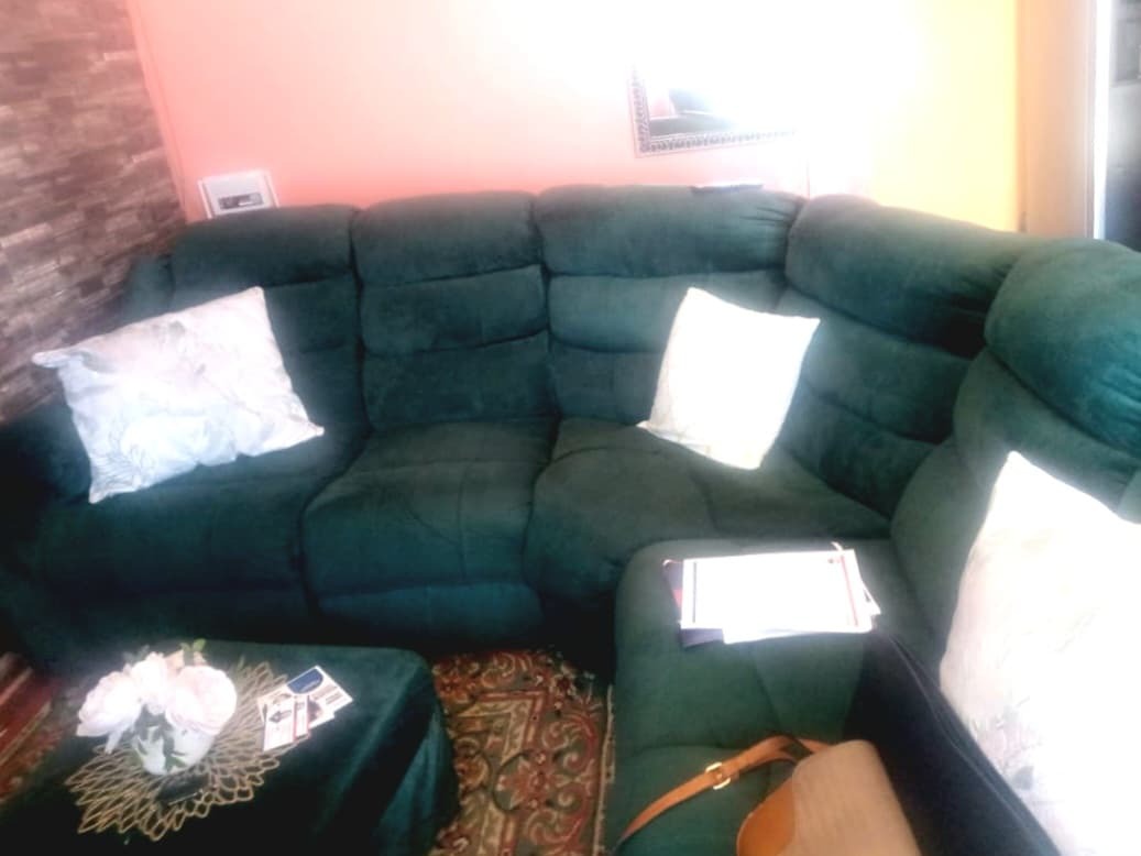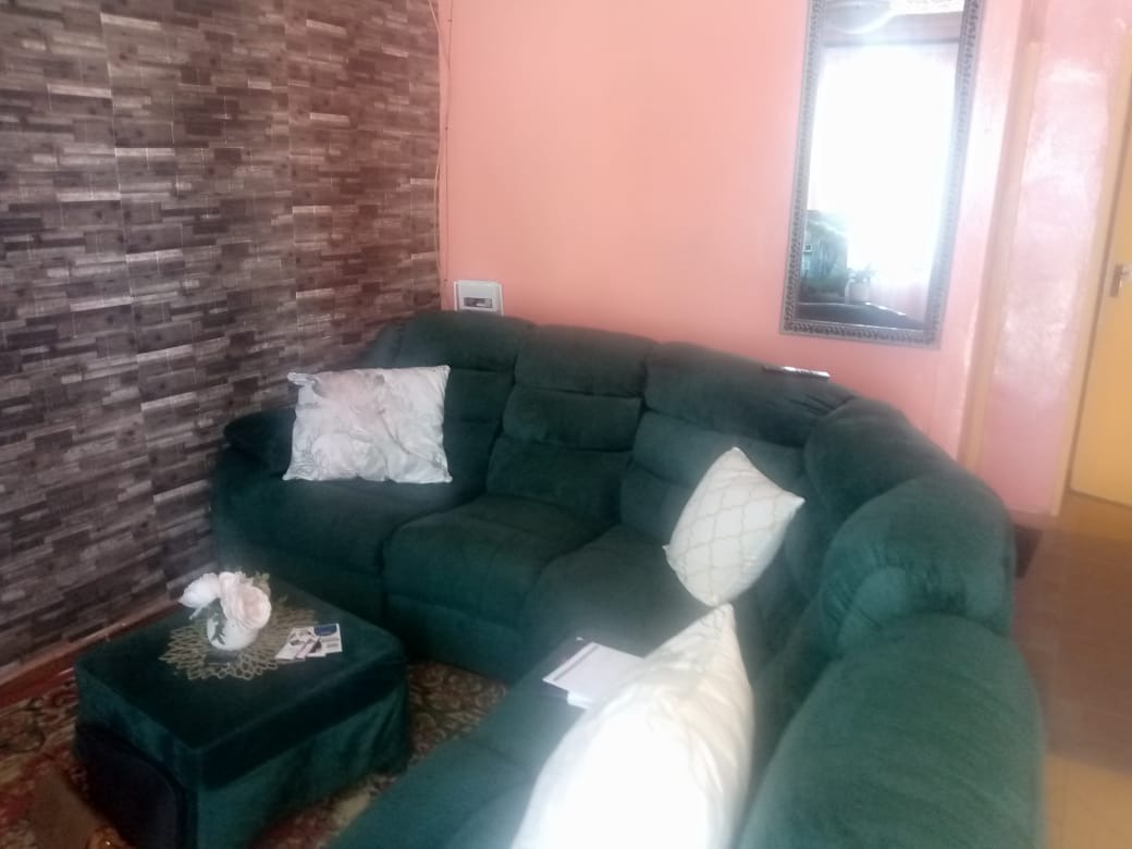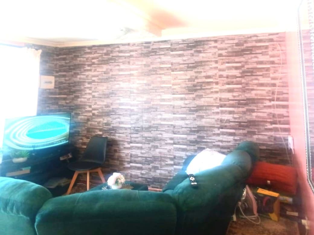 Step inside to a comfortable and inviting living space. The lounge features warm peach/coral walls and a stylish textured accent wall, creating a cozy atmosphere perfect for unwinding. A functional kitchen awaits your culinary adventures, complemented by a convenient outside toilet.